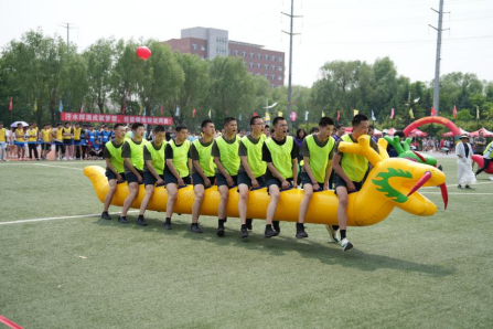 团体项目则是智慧与协作的舞台。“巨龙腾跃”时,十人组成的队伍步伐整齐划一,伴着铿锵有力的口号,让彩龙在赛道上灵动腾跃;“大生产”比赛中,师生们化身“田间能手”,抢种抢收间争分夺秒,现场气氛紧张热烈;“车轮滚滚”环节,大家齐心协力操控“履带”,面对突发状况沉着应对,凭借默契配合稳步前行;2000米有氧走考验耐力,师生们步伐稳健、精神抖擞,以团结奋进的姿态完成赛程,尽显坚韧不拔的精神。