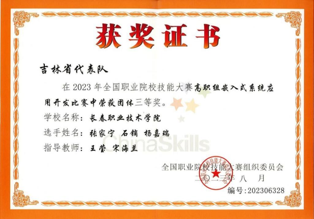 嵌入式系统应用开发赛项获奖证书