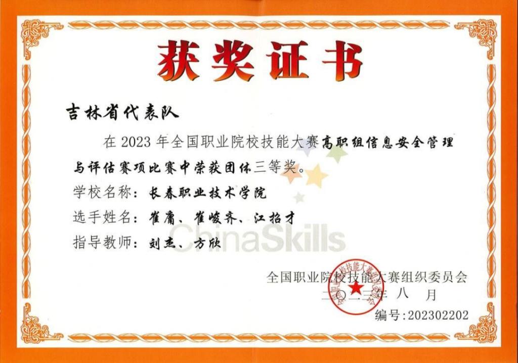 信息安全管理与评估赛项获奖证书