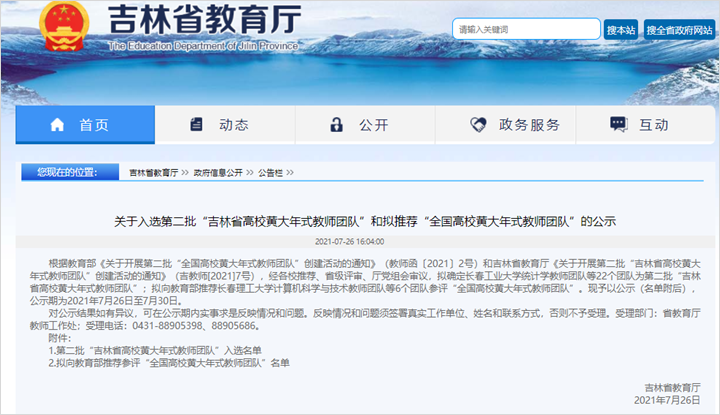 图1:吉林省高校黄大年式教学团队网站公示截图