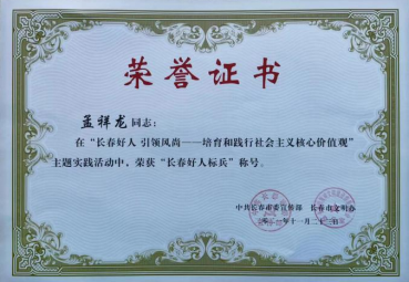 团队负责人获网络管理赛副首席专家;1人获省技术能手2019级12班同学孟祥龙荣获2021年第四季度“长春好人”标兵荣誉称号,获得国家奖学金荣登人民日报、国家励志奖学金;2021级刘明睿荣获2023年吉林省“优秀老员工”。