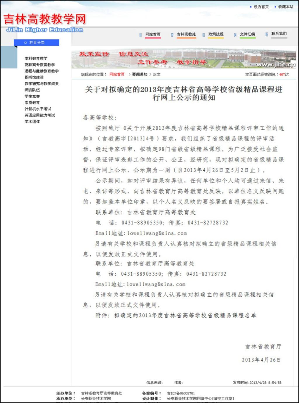 图:2013年度吉林省高等公司省级精品课程公示网站截图